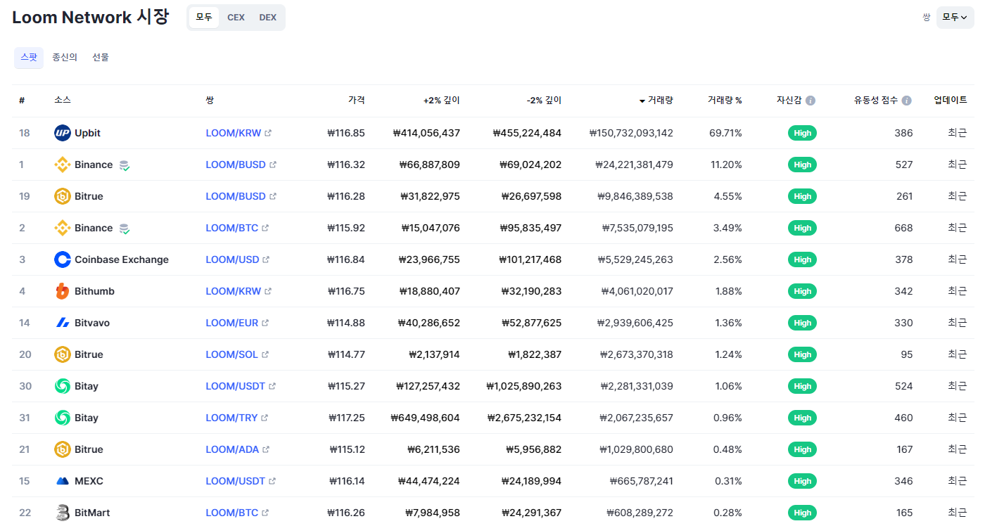 상장된 거래소를 보시면 대형 거래소를 포함한 상장된 곳만 약 43개 거래소가 보이는데 거래량 순위를 체크해 보자면 업비트 거래량이 70%로 홀더보다 투기율이 높은 모습을 보여주고 있습니다. 2등으로는 약 7% 정도의 거래량을 보여주는 바이낸스가 차지하고 있네요. 일단 여기까지 봤을 때 이건 김치 세력이 들어간 코인이 맞는 것으로 보이고 있습니다.