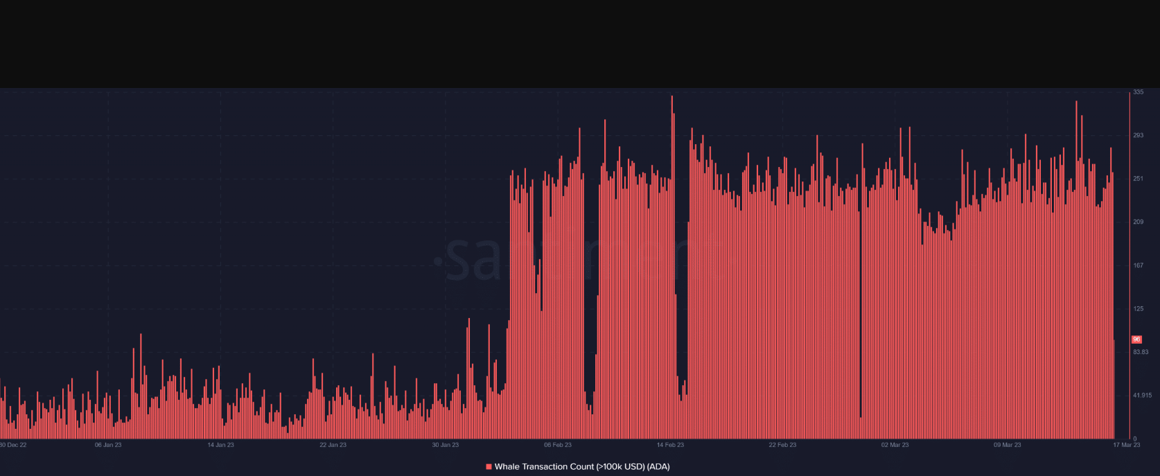 최근 10만 달러가 넘는 고래들의 거래는 300건을 넘어선 상태이며 에이다 거래 규모의 증가는 기관 투자자의 자산에 대한 관심이 증가하고 있음을 나타냅니다. 카르다노의 새로운 개발은 스스로를 확립하기 위한 수년간의 투쟁을 고려할 때 일관성이 입증된다면 크게 환영할 만한 변화가 이루어질 것입니다.