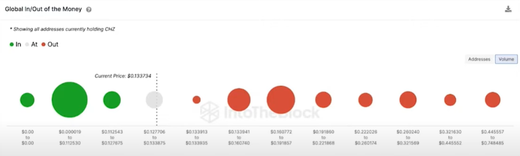 다음으로 인투더블록의 giom 지수는 챌리지가 0.19달러를 향한 새로운 지역 최고점에 도달하기 위해 다음 랠리를 이용할 수 있음을 나타냅니다. 현재 차트는 칠리즈 토큰이 0.14달러 수준에서 최소한의 저항에 직면할 수 있음을 보여주는데 이 수치는 8500개의 주소가 지불한 평균 가격으로 10억 7천만 칠리즈 토큰에 달하며 이 저항이 무너지면 랠리는 충분한 모멘텀을 얻어 0.19달러에 도달할 수 있습니다. 이 영역에서 총 20억 개의 토큰에 대해 0.19달러에 매수한 8800개의 주소가 있습니다. 이 가격은 앞으로 몇 달 동안 챌리지에 강력한 저항이 될 수 있죠. 반대 시나리오에서 챌리지 토큰이 0.12달러에서 지지를 잃으면 약세가 다시 우위를 점할 수 있고 이 지지선이 유지되지 않으면 칠리즈의 가격은 다음 지지선인 0.07달러까지 떨어질 수 있으므로 이 점 참고하시기 바랍니다.