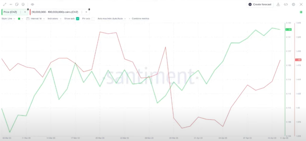 보이시는 차트는 3월 30일에서 4월 11일 사이에 1천만에서 1억 챌리지 토큰의 장고를 보유한 고래가 1억 2천만 토큰을 추가했음을 보여주고 있습니다. 크립토 고래가 단기간에 그렇게 많은 양을 투자한다는 것은 일반적으로 다음 가격 상승을 위한 위치에 있다는 것을 의미합니다. 위에서 언급한 패턴은 칠리즈의 가격 움직임과 밀접하게 연관되어 있음을 알 수 있습니다. 이 패턴이 반복되면 칠리즈 토큰 보유자는 앞으로 몇 주 안에 추가 가격 인상을 기대할 수 있습니다.