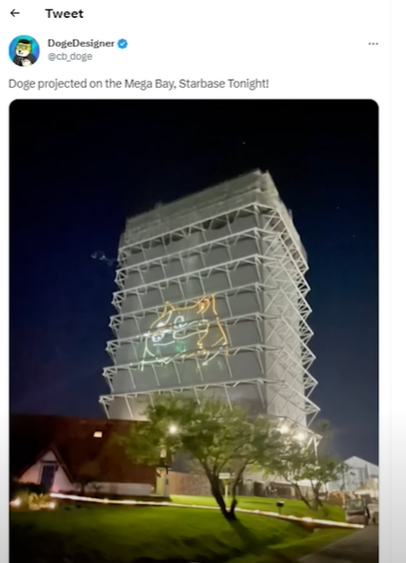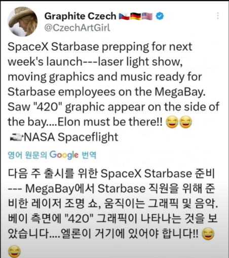 그리고 이틀이 지난 17일 도지 디자이너는 스타십 발사를 직접 보기 위해 미국으로 입국 후 일요일 저녁 발사장에서 밤을 세웠습니다. 그런데 도지 디자이너가 이런 트윗을 올렸습니다. 머스크의 스타 베이스 경납고에 도지 그래픽이 있었다라고요. 그리고 추가 증언이 나오는데 지금 사진을 보시면 한 아티스트가 이렇게 트윗을 했습니다. 다음 주 스타십이 발사하는 곳인 스타베이스에서 메가베이에서 준비한 레이저 조명쇼 움직이는 그래픽 및 음악 그리고 측면에 420 그래픽이 나타나는 것을 보았다. 일론이 거기에 있어야 한다라고요.