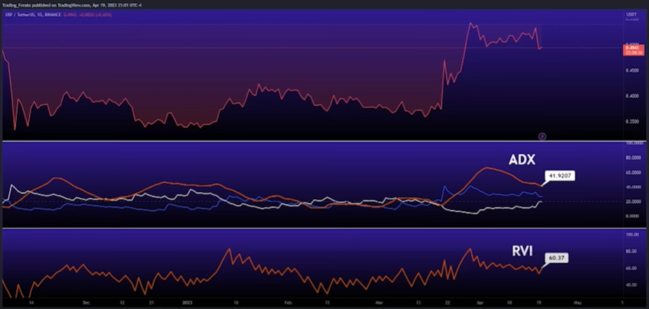 먼저 리플 xrp의 가격 예측부터 전해드리겠습니다. 암호화폐 분석 매체 트레이딩뷰의 2023년 xrp 가격 예측에 따르면 보이시는 차트에서 adx 및 rvi 기술 분석 지표를 사용하여 xrp의 강도와 변동성을 분석했는데 추세 모멘텀의 강도를 분석하기 위해 adx에 주목해보자면 adx 값은 +di와 -di로 두 방향 이동 지표에서 파생되며 0에서 100 사이로 표시됩니다.