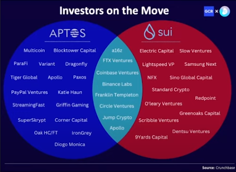 돌아가는 방식은 좀 다르긴 한데 수위랑 에토스 둘 다 빠른 거래 처리 속도를 강조를 하잖아요. 앱토스는 최대 16만 tps까지 수위는 12만 tps까지 가능하기 때문에 처리 속도도 사실상 큰 차이는 없어요. 큰 차이는 없는데 가장 큰 문제가 앱토스랑 sui가 두 개의 프로젝트에 둘 다 다리를 걸쳐놓은 얘네들이 앱 토스를 빠르게 정리를 하고 수위로 넘어갈 생각을 하고 있다고 봅니다. 그러니까 현재 기술적으로도 sui가 더 우위를 차지하는데 지금 앱토스에 투자가 들어간 이 vc들은 투자를 하고 지분도 제대로 못 받았어요. vc들 락업 물량이 달마다 찔끔찔끔 풀리고 있기 지금 여기 가운데 있는 유명한 애들 a16z트라든가 ftx 벤처스, 바이낸스 랩스, 코인 베이스 벤처스, 서클사까지 가운데에 있는 유명한 애들 얘네들은 sui가 출시하면 이걸 전부 다 빠르게 털어내고 sui로 넘어가야겠다라는 생각을 할 수밖에 없다고 봐요. 그래서 최근에 단기적으로 앱토스가 다섯 배 펌핑이 나온 이유가 그런 이유이지 않을까 싶기도 하고요.