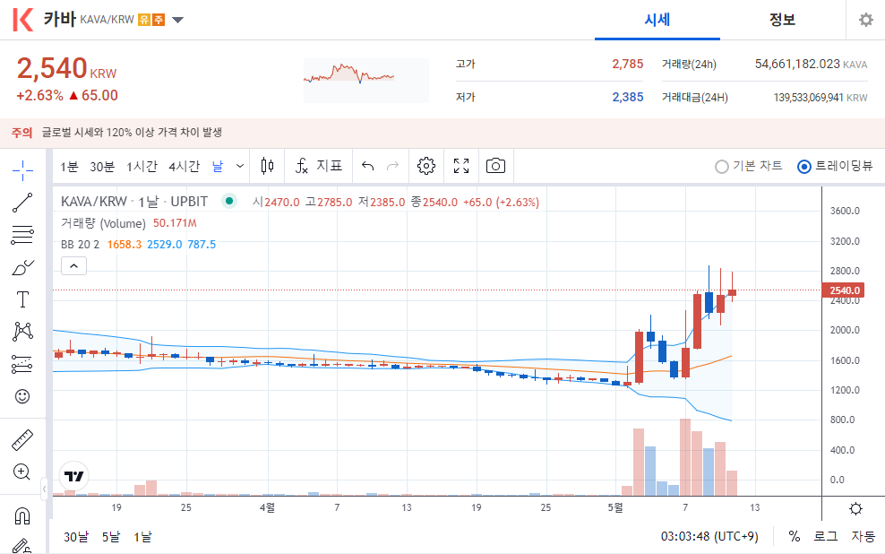 카바 3일간 약 77%의 상승을 보여주고 있습니다. 현재 카바는 업비트 유의 종목이며, 이틀 전부터 지금까지 폭등을 하고 있는 상태입니다. 막상 비트코인 경우에 30k이에서 막히며 조정을 받고 있으며, 다른 알트코드 또한 맥을 못 추리는 모습을 보여주고 있습니다.