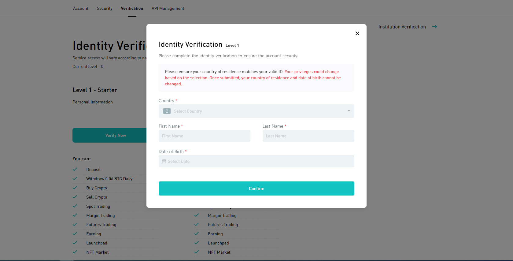 Level1 Verify Now를 누르면 나라 / 이름 / 생년월일을 입력하는 칸이 나옵니다. 입력해줍니다.