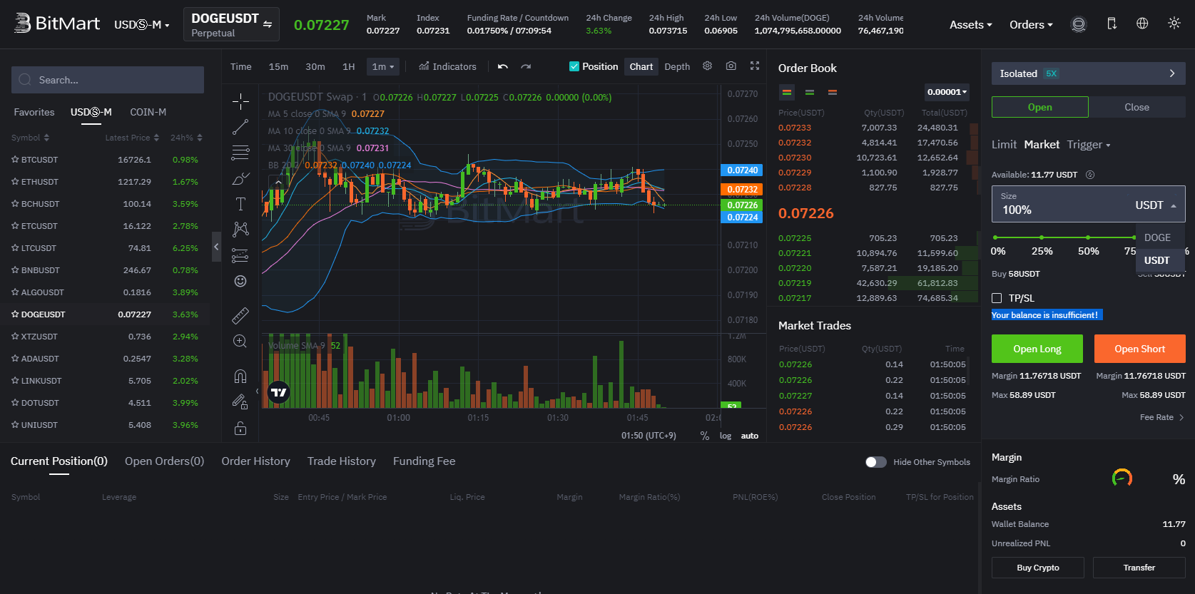 도지코인인데 USDT로는 물량이 얼마 안 되어 거래가 안 되서, DOGE로 놓고 거래 진행 했습니다.
