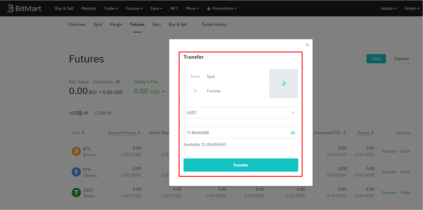 Spot(현물)에서 Futures(선물) 계정으로 USDT를 옮겨 줍니다.