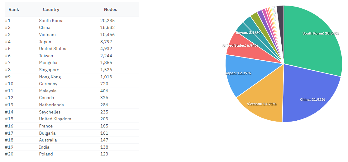 파이코의 노드 점유율은 대한민국이 전 세계 1위입니다. 사실상 중국과 베트남 그리고 대한민국이 전 세계 노드의 80% 가까이 차지하고 있고 전 세계에서 가장 많은 노드를 보유하고 있는 중국과도 인구 수 대비 노드 비율을 따져본다면 10배 이상 많기 때문에 사실상 파이 코인은 대한민국에서 가장 인지도가 높은 코인이라고 할 수 있습니다.