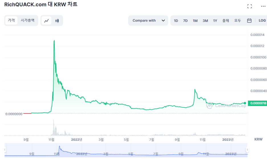 리치쿼크는 개코인 천하에서 혼자 고군분투하고 있는 밈코인입니다. 리치쿼크의 쿼크는 쿽, 즉 꽥이라는 뜻입니다. 2021년 4분기와 2022년 4분기에 폭발적인 상승을 보여준 이력이 있습니다. 리치쿼크 또한 데이비도지 코인처럼 디플레이션 암호화폐 토크는 총 공급량을 줄이기 위해서 거래 시 12%의 수수료를 붙이고 그 중 2%는 소각, 나머지 4%는 토큰 보유자에게 반환되는 시스템을 사용하고 있습니다. 그리고 미주나 유럽에서 친숙한 도널드 덕과 매우 흡사한 캐릭터의 이미지는 초기 도지코인처럼 수많은 밈으로 활용되어 sns상에서는 베이비도지와 시바이누 같은 개코인들을 이기고 밈코인 소셜 랭킹 1등도 달성하는 등 해외에서는 아주 인기가 높은 코인입니다.