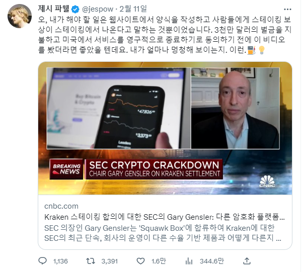 그런데 크라켄 거래소의 창시자 제시 파월이 한 말에 따르면 전혀 다릅니다. "웹사이트에서 폼 다운 받아서 제출만 하면 되는 거였어? 그리고 우리 웹사이트에다가 스테이킹 보상은 스테이킹을 통해서 만들어집니다.라고 쓰기만 하면 되는 거였어? 괜히 3천 달러 벌금냈네 이거. 괜히 스테이킹 서비스를 영구 중단 시켰네~ 내가 바본가봐."라고 쓰면서 게리 겐슬러를비꼬면서 자기를 자책하듯 글을 올렸습니다. 사실은 그렇게 간단한 일이 아니라는 걸 뜻하고 있는거죠~ 게리겐슬러는 간단하게 말했지만 무엇을 어떻게 제출해야하는 지 구체적으로 sec에 질의하면 답을 해주지 않을 겁니다. 마치 닥사에 위믹스가 계속 서류를 냈지만 무엇을 고쳐야할지 알려주지 않고, 고쳐서 냈음에도 인정하지 않는 모습이 겹쳐집니다. 미국이나 우리나라나 상황은 마찬가지인 듯 보입니다.