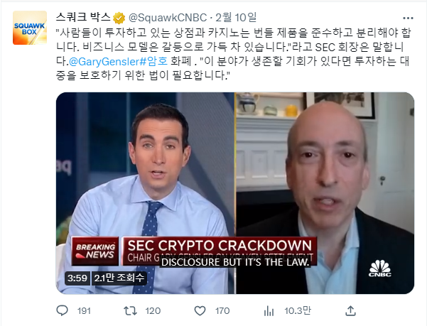 게리갠슬러가 cnbc 방송에서 인터뷰를 하였습니다. 비트코인 시장을 상점과 카지노와 비교해서 이야기를 했습니다. 카지노들이 빨리 와서 자신들의 정책에 따라야 하는데 말을 안 듣는다는 뜻이겠죠. 이걸 따르지 않으니 따끔한 맛을 보여줬고, 이는 곧 투자자들의 승리다라고 이야기 하고 있습니다. 정작 투자자들은 그렇게 생각하고 있을까요?