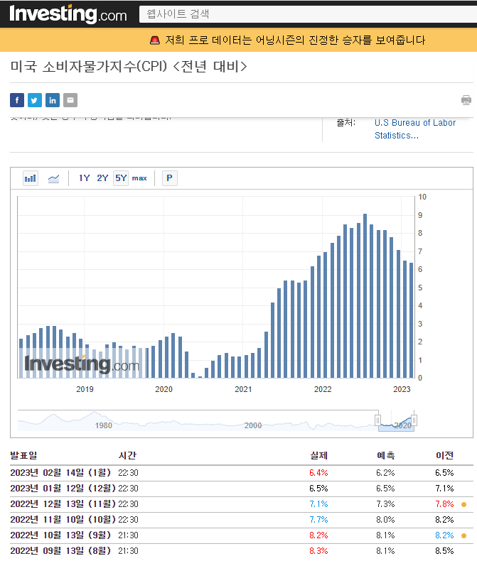 2월 14일 새벽 03시에 미국 cpi가 발표됐습니다. 예측치 6.2%보다 0.2%높은 6.4%로 발표가 났는데요. 이는 지난 달보다 0.1% 밖에 떨어지지 않아 물가가 많이 잡히진 않았습니다. 시장은 빠져야 함이 맞지만 발표와 함께 시장은 약상승하는 모습을 보여줬습니다.