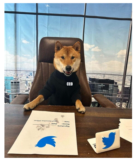 얼마전에 일론머스크가 자신의 트위터에 플로키가 트위터 ceo자리에 앉아 있는 사진 하나를 올렸다. 이 이미지는 일론머스크가 자신의 트위터 조회수가 안 나와서 엔지니어를 갈구고, 해고까지 시켰던 과거를 청산시키듯 엄청난 조회수를 기록했다. 이 사진을 확대를 해서 자세하게 보자. 가운데 부분에 글씨가 하나 적혀 있는 게 보입니다. 뭐라고 적혀 있나요?